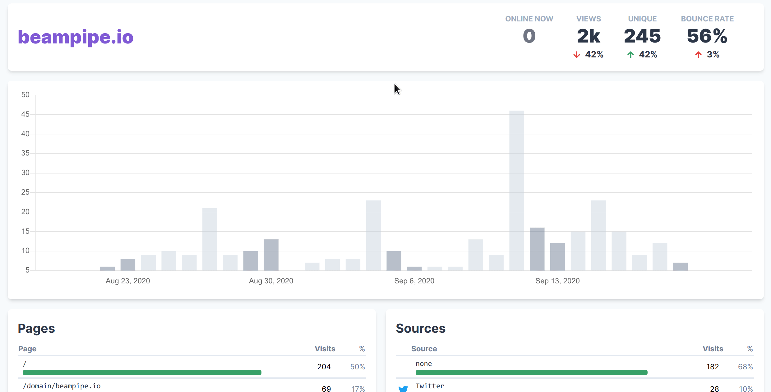 Major: Added drilldowns! You can now click on the Pages table, the Sources table and the Countries map to explore subsets of your data. Currently this is applied to the time chart but soon it’ll show up in other charts as well.